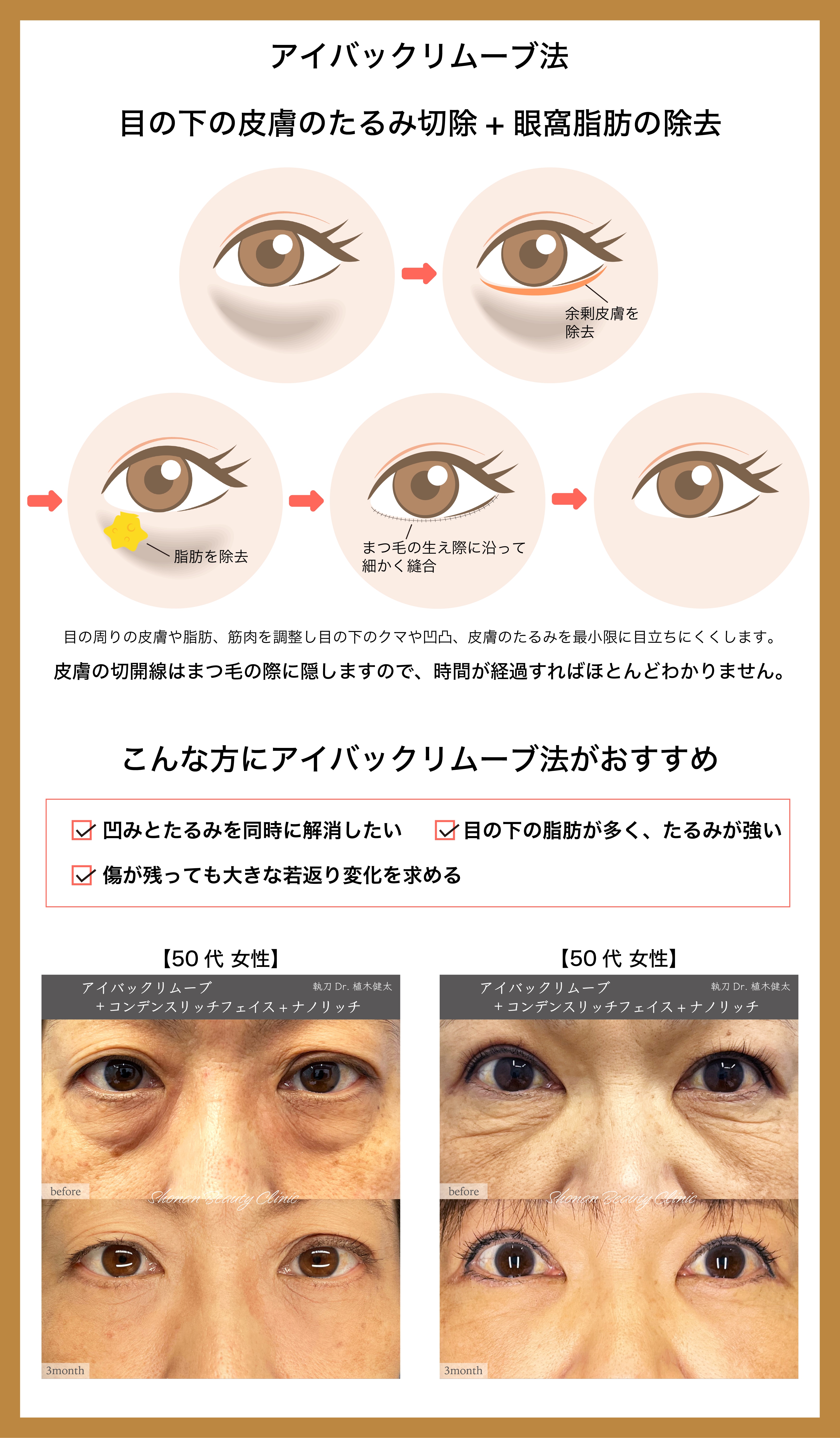 | 目の下の切らないクマ・たるみ(ふくらみ)取り(麻酔(局所麻酔)代が含まれています。※別途安心麻酔(静脈麻酔)代がかかります。 ) | 79,100円 |