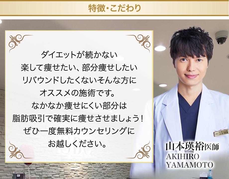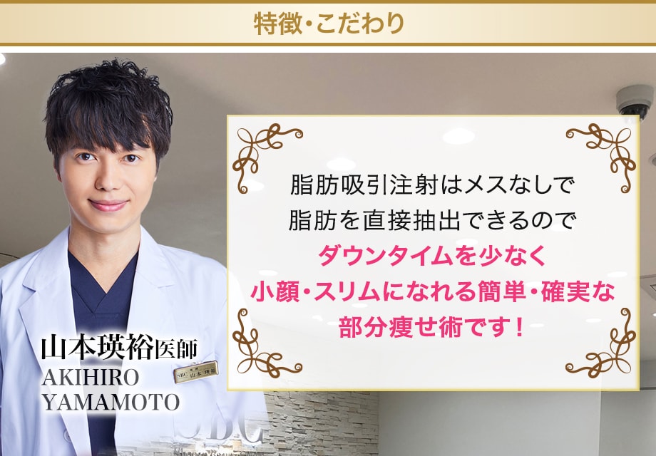 脂肪吸引より細い注射器を使用して、脂肪を吸引することで脂肪細胞を減少させ、リバウンドしにくい痩身効果(部分痩せ)を可能にした治療です。 脂肪吸引のような圧迫固定の必要はなく、傷跡の心配もほとんどありません。