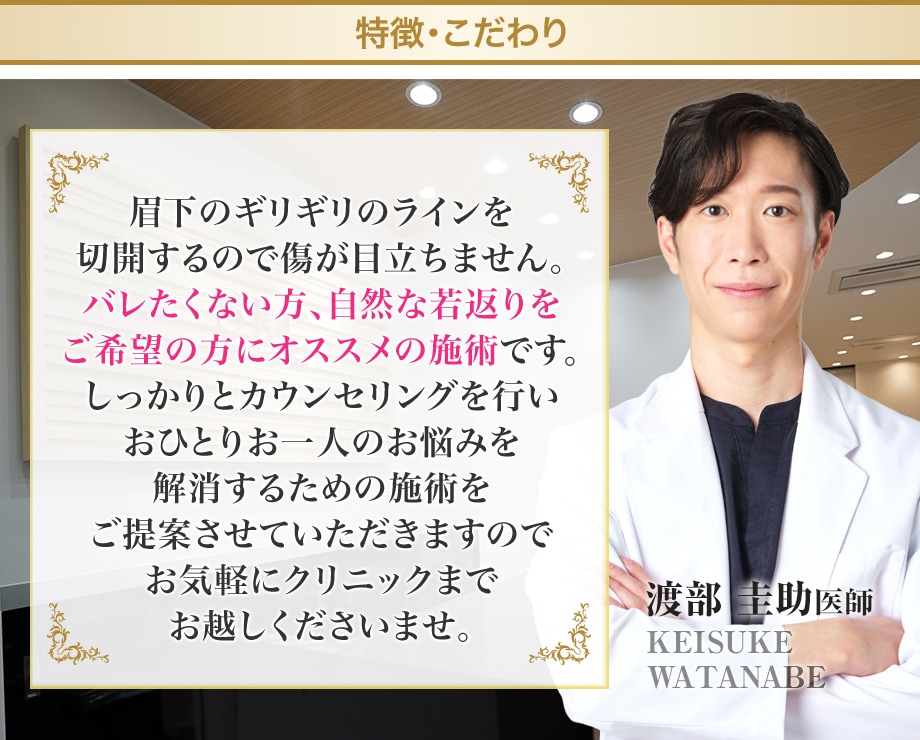 眉下のギリギリのラインを切開するので傷が目立ちません。