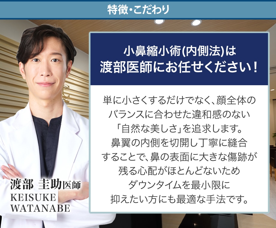 傷跡が目立ちにくい鼻腔内からのアプローチ(内側法)に加え、独自の「締め付け縫合」を組み合わせることで、後戻りを防ぎながら小鼻の広がりを改善。