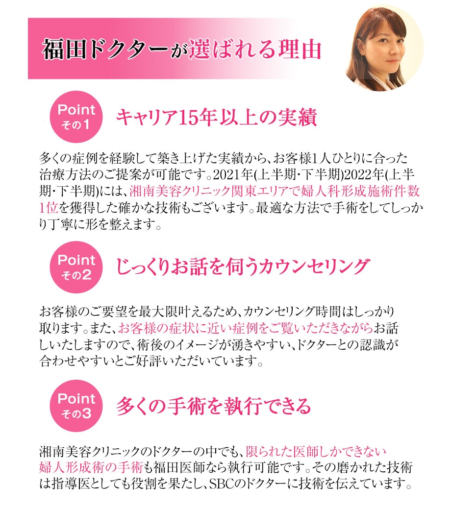 ひとりで悩んでいる方に向けて、どんな治療が適されているのか、 症例多数のDr.福田が診察致します。洗練された技術を持った医師のみが出来る膣縮小術と膣壁形成術を、横浜東口院でお受けいただけます。