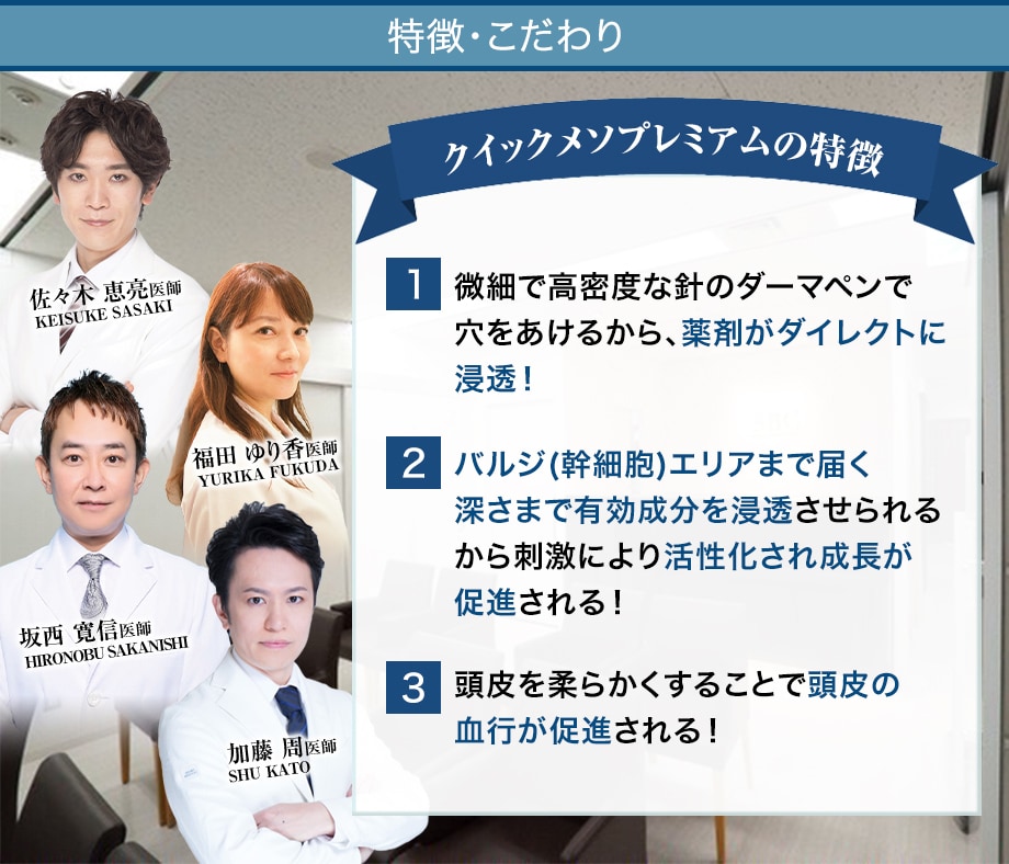 クイックメソプレミアムを繰り返し行う事で、高い効果が得られるため満足度も非常に高い治療方法です。
