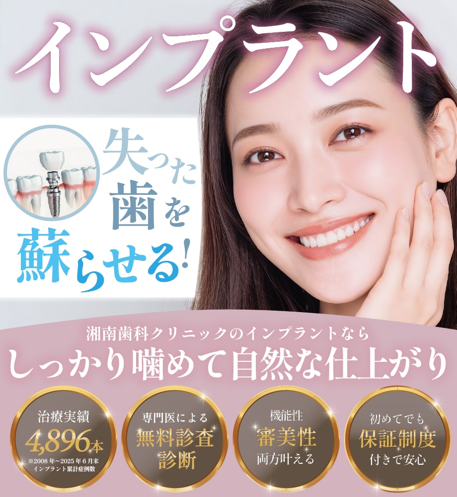 インプラントで虫歯などで抜けてしまった歯を取り戻しませんか?湘南歯科はインプラント治療の症例数も豊富!失ってしまった歯の部分にインプラント治療をすることで【天然の歯と限りなく近い見た目】と【噛む機能】を再現することが可能です。