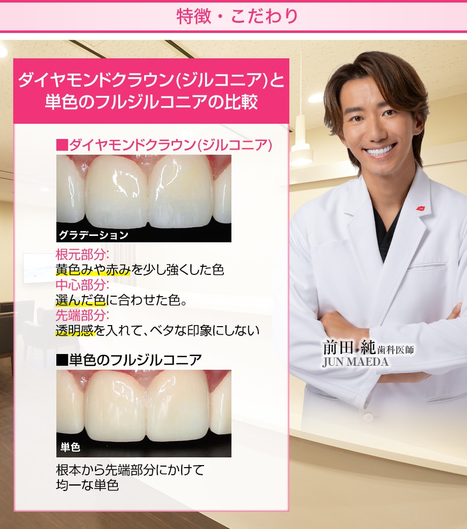 強度が高いフルジルコニアセラミックに、ステイニング(グラデーションの着色)をすることで、天然歯に近い自然な仕上がりにすることができます。