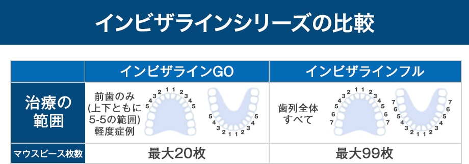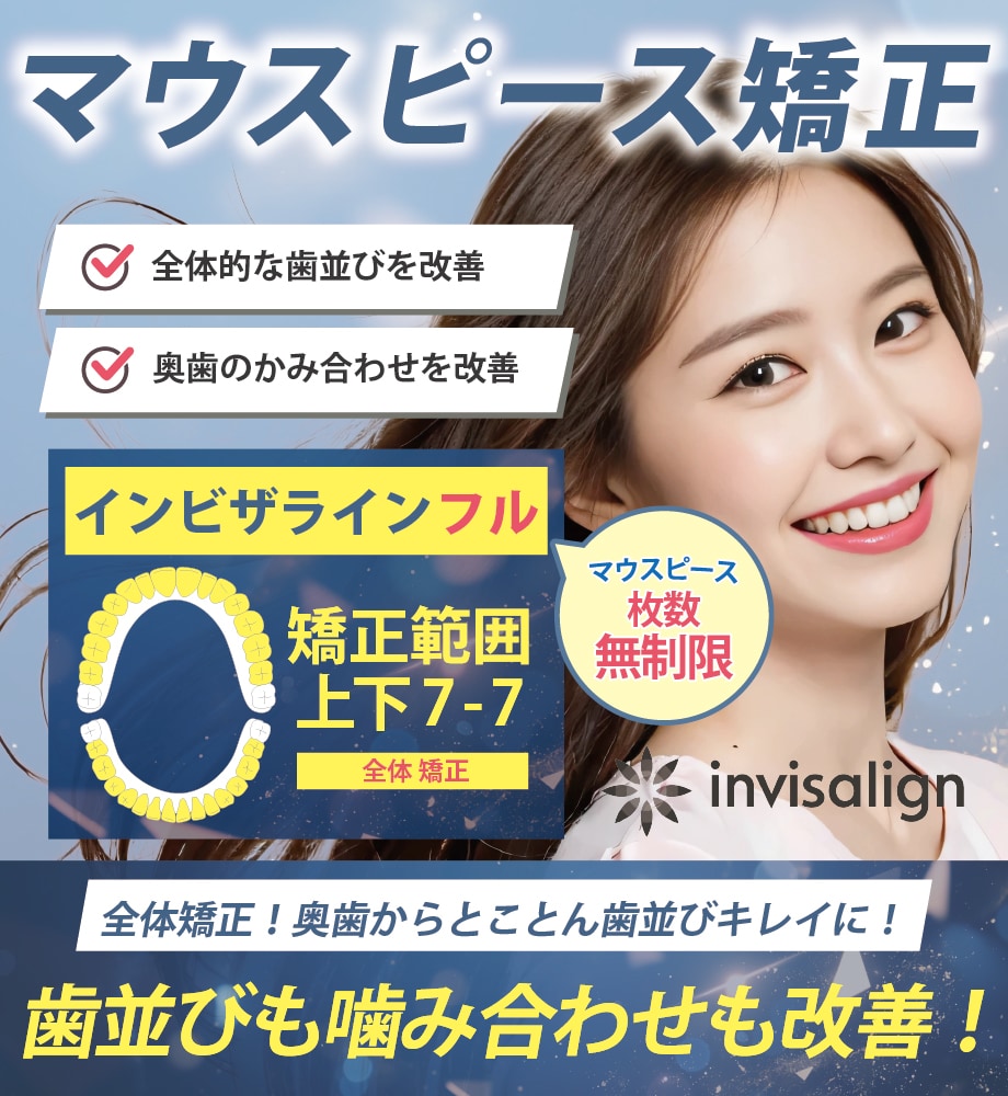 インビザラインフルは矯正範囲が7番目の歯~7番目の歯までの【全体矯正】です。マウスピースの【枚数無制限】なので、幅広い症例に対応できます!矯正期間は【平均2年~2年半】。奥歯から歯列全体を矯正するので《全体的な歯並びの改善》はもちろん、《横顔の見え方やEラインの改善》も期待できます!