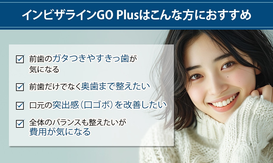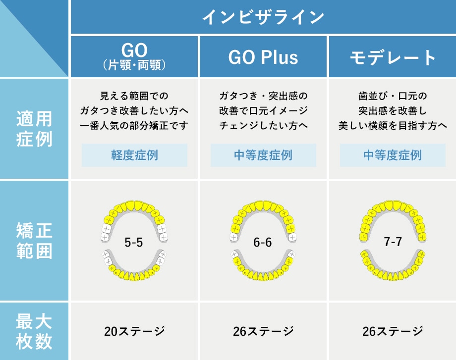 インビザラインGO Plusは、従来のGOプランよりも適応範囲が広がり、左右6番目の奥歯(第一大臼歯)まで動かせる新しいマウスピース矯正です。