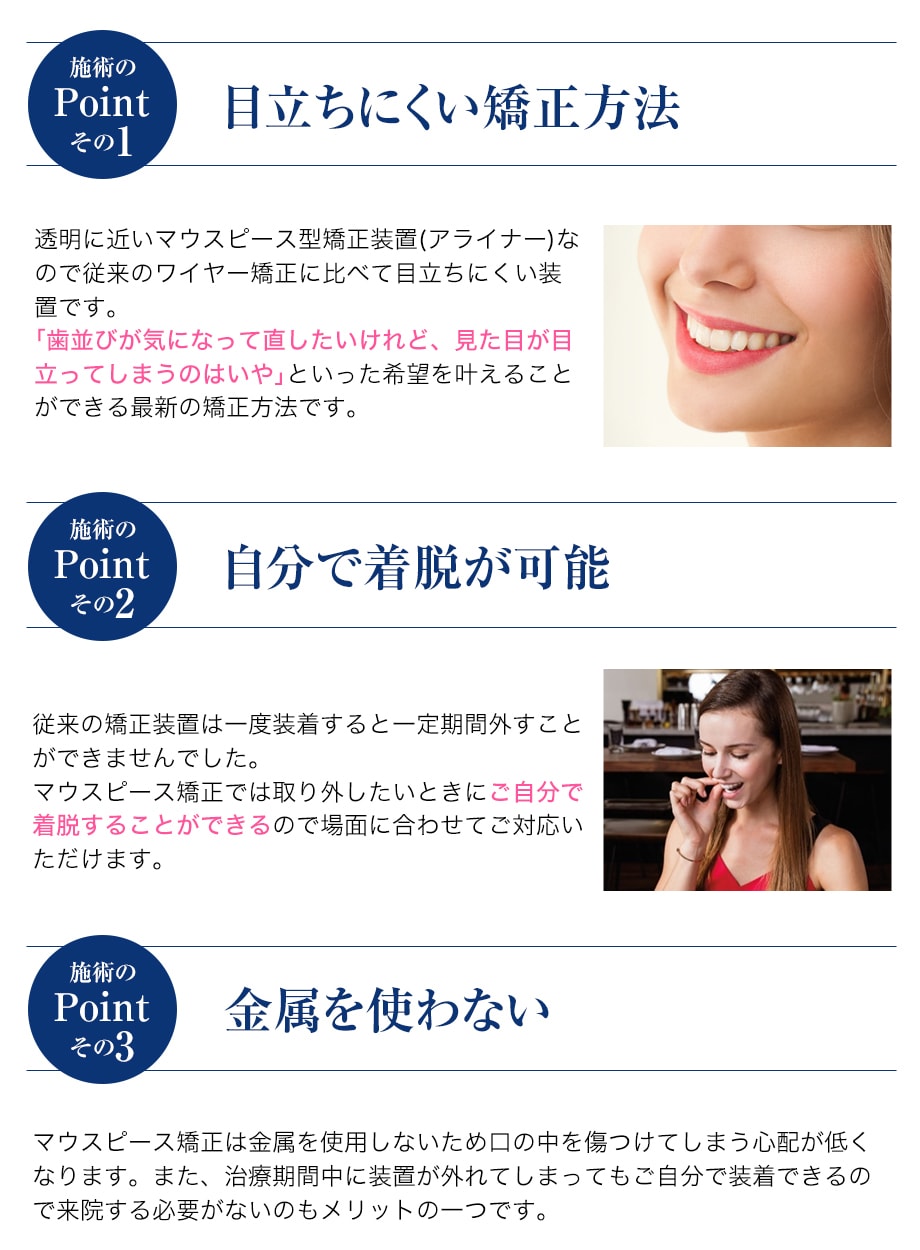 透明で目立ちにくく、取り外しも可能なため、日常生活への負担も少なく治療が可能です。