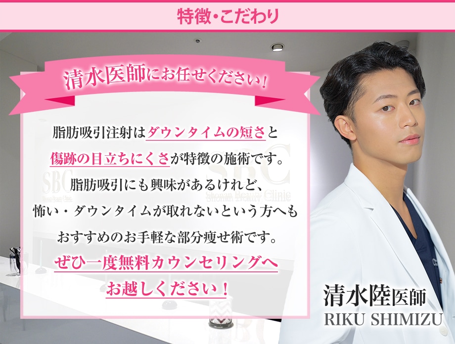 切開なしで脂肪を直接抽出できるので、脂肪溶解注射より確実に、脂肪吸引よりダウンタイムを少なく、狙った部分の脂肪を減らすことができる安全・確実・簡単な部分やせ術です。