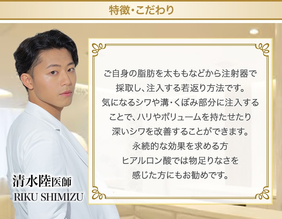 分離した脂肪を、気になるシワや溝、くぼみ部分に注入することで、肌にハリやくぼみにボリュームを持たせたり、深いシワを改善することができます。