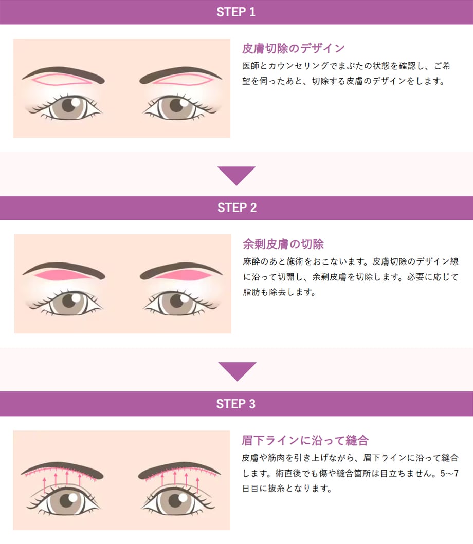 眉下のたるんだ皮膚を切開して引き上げることで、