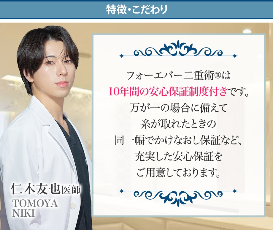 スクエア型に糸をかけることで眼瞼内組織への圧を分散させることができ、同時に糸2本をクロスさせることで極限まで取れづらい埋没法を実現しました。