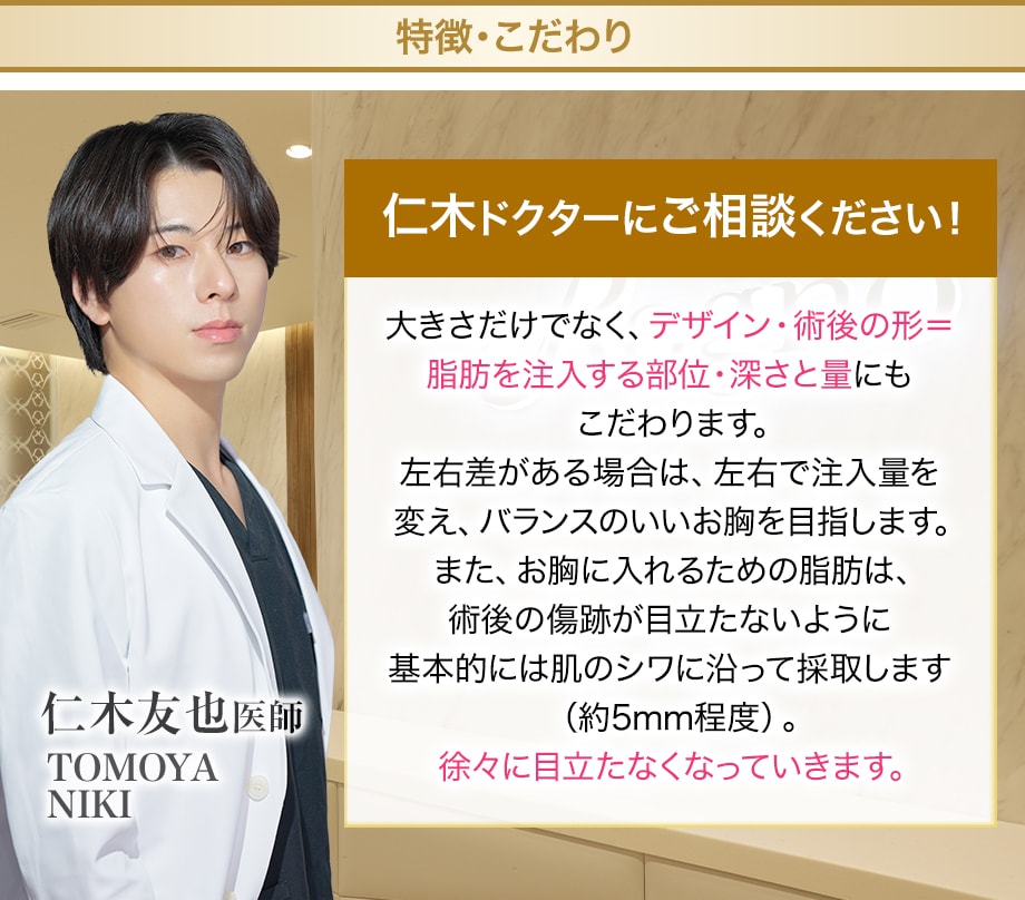 コンデンスリッチ豊胸は、採取した脂肪から不純物・水分の除去に加え、コンデンス(濃縮)技術で、老化で肥大化した脂肪細胞を除去し、定着に有利な脂肪を仕分けることが可能です。
