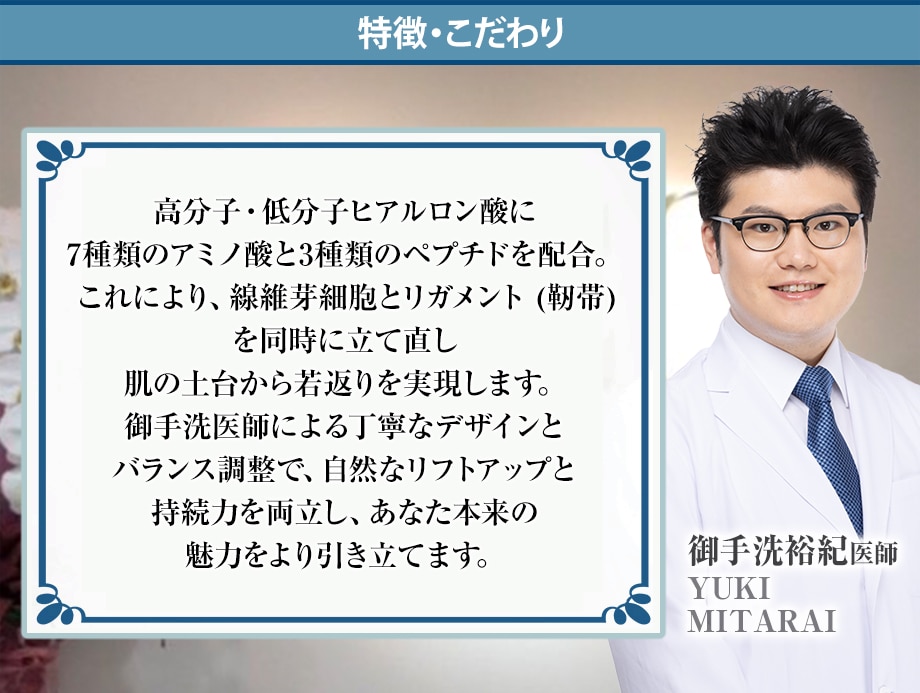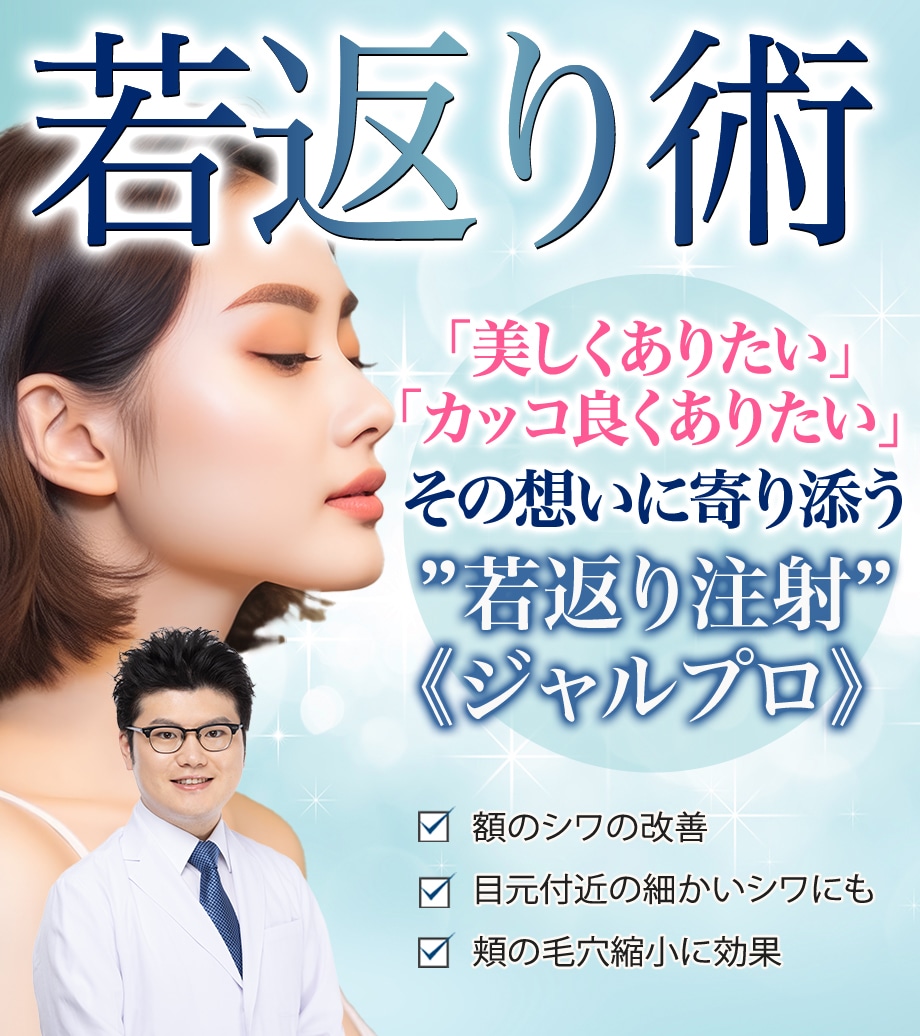 ジャルプロスーパーハイドロとは、非架橋ヒアルロン酸、7種類のアミノ酸、3種のペプチドという3つの主成分が、皮膚や脂肪を支える土台となるリガメント(靭帯)を強化し、肌質改善やハリ・弾力、リフトアップ、タイトニング等の効果をもたらします。 乾燥や小じわ、たるみ、シワなどにお悩みの方におすすめの治療です。