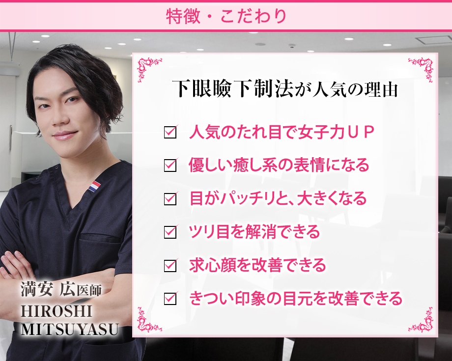 下まぶたの中央から目尻のカーブを下げることでタレ目っぽい印象にする手術です。糸のみの方法と比べ後戻りが圧倒的に少なくなります。「グラマラスライン形成」という名でも注目を浴びています。