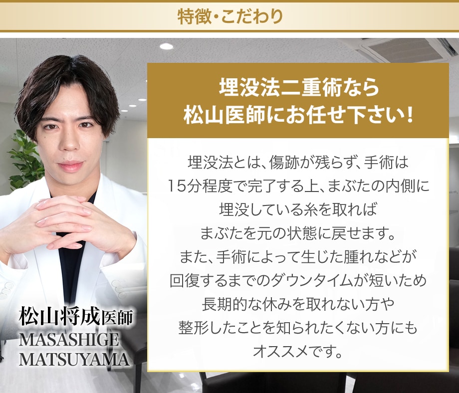 上まぶたの“瞼板”と呼ばれる軟骨ほどの硬さの板にトライアングル形式で、極細の医療用糸を留めるので、従来の埋没法に比べ術後の腫れが抑えられ、持ちも良いのが特徴です。また糸針が細いため、傷跡や糸の結び目が小さく目立ちにくく、自然な二重形成が可能です。