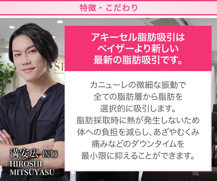 脂肪吸引のスペシャリスト・満安医師は、アキーセルの微細な振動を操り、周辺組織へのダメージを抑えながら滑らかなボディラインを彫り出します。