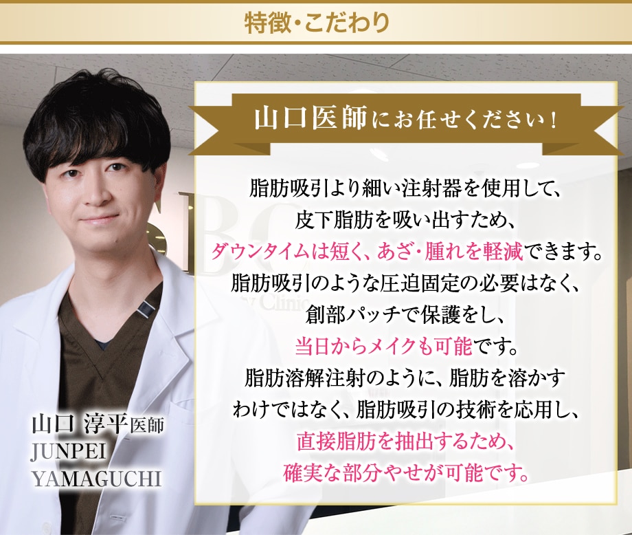脂肪吸引より細い注射器を使用して、皮下脂肪を吸い出すため、ダウンタイムは短く、あざ・腫れを軽減できます。笑顔で親しみやすい診察を提供している山口医師にお気軽にご相談ください!