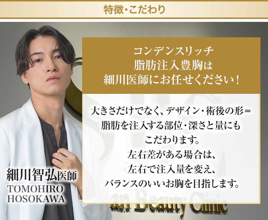 コンデンスリッチ豊胸は、採取した脂肪から不純物・水分の除去に加え、コンデンス(濃縮)技術で、老化で肥大化した脂肪細胞を除去し、定着に有利な脂肪を仕分けることが可能です。