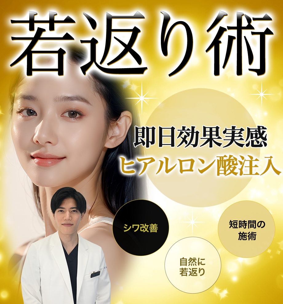 ヒアルロン酸は人体にもともとある物質です。コラーゲン組織の組織を保持する働きが認められており、肌組織の水分、潤滑性、柔軟性を保つのに役立っています。ヒアルロン酸の注入に使用される製剤は透明なジェル形態です。ヒアルロン酸の注入を行うと、もともと体内に存在していた自己のヒアルロン酸と融合して皮膚にふくらみを持たせ、シワを隆起させます。注入することでシワを改善のみならず顔を支える靭帯を調整し若返りが可能な施術です。
