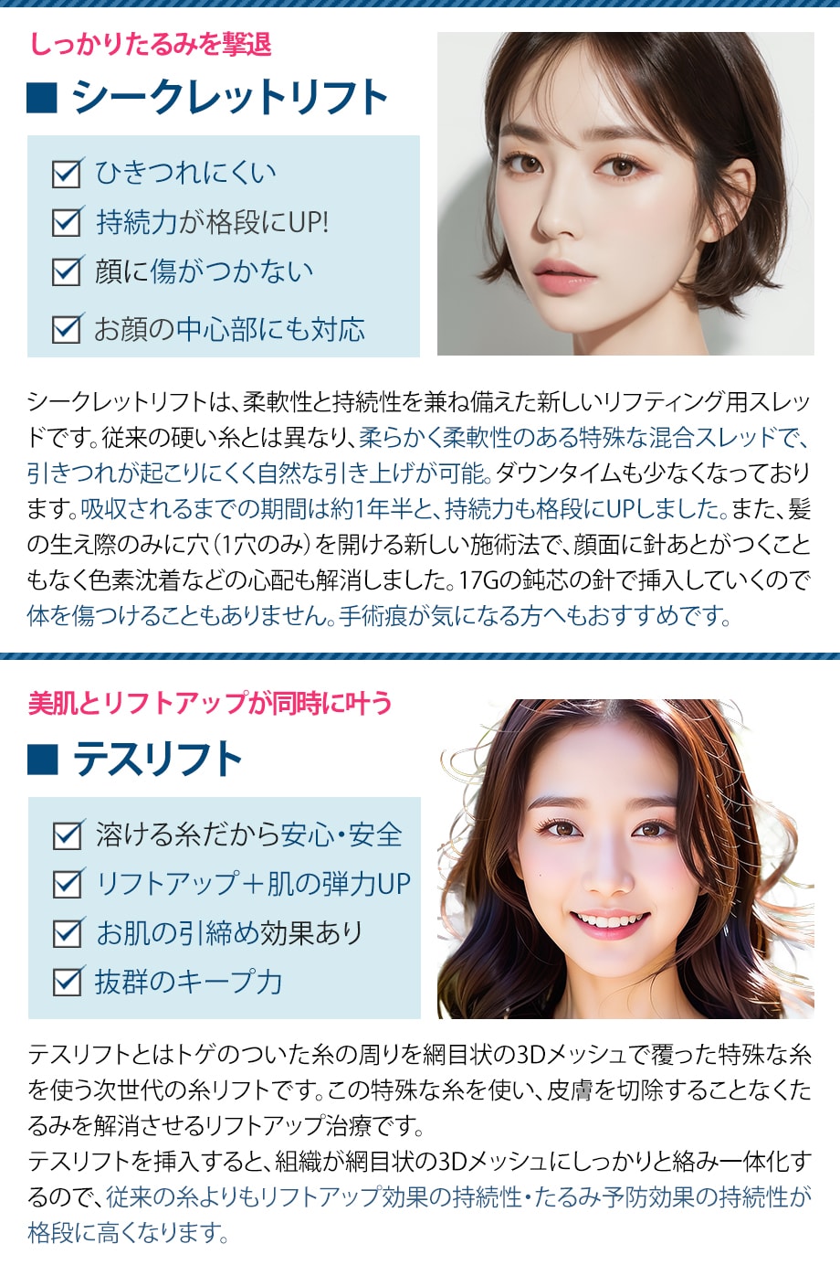 たるみやほうれい線、マリオネットラインやフェイスラインのもたつきの改善が期待できます。 また、糸を挿入することで皮膚の組織が活性化し、コラーゲンが増生されることでお肌のハリ・ツヤアップも期待できます。
