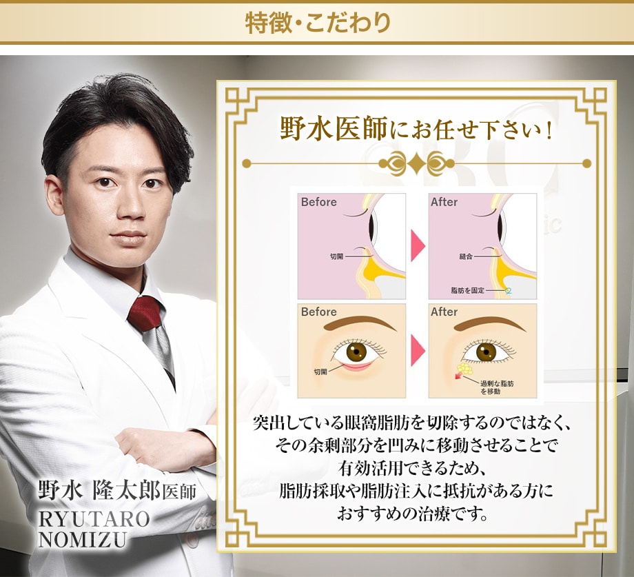膨らんでいる部分からくぼんでいる部分に眼窩脂肪を移動させることで、膨らみと溝を同時に改善し、フラットな状態にすることができるため、眼窩脂肪を切り離すことなくクマを改善することができます。