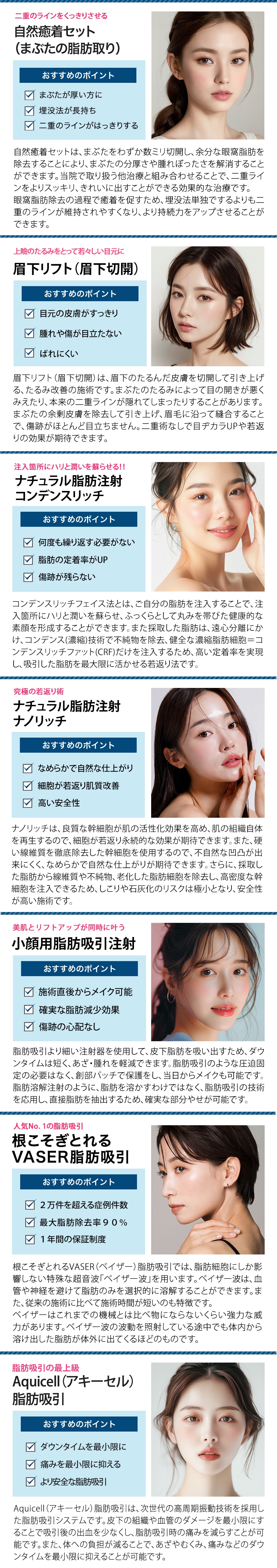 また、手術による目元や輪郭のたるみ取り、ご自身の脂肪を注入・吸引して肌にハリを持たせ、しわを改善する治療など様々です。