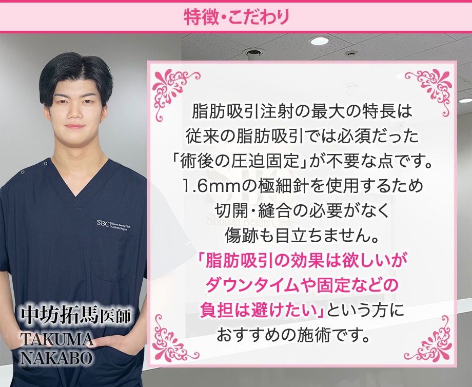 脂肪溶解注射とは異なり、注射器で脂肪を直接「吸い出す」確実性の高い部分痩せ治療です。脂肪細胞そのものを物理的に除去するため、直後から変化を実感しやすく、リバウンドのリスクも最小限。従来の脂肪吸引に比べ圧迫固定や術後の抜糸が不要。脂肪吸引よりもダウンタイムが短く、ピンポイントで気になる部位をサイズダウンさせることが可能です。