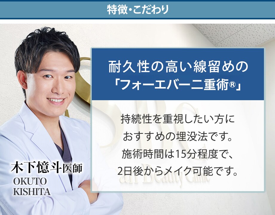 おくと先生の二重埋没法は、高品質の二重施術にも関わらず安価が魅力です。また腫れづらく、取れにくい二重として人気な治療です。