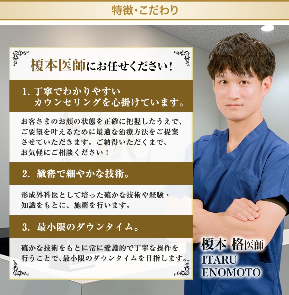 カウンセリングから術後のケアまで誠実に担当します。宮崎・九州の美のお悩みは、ベテランドクター榎本にお任せください。