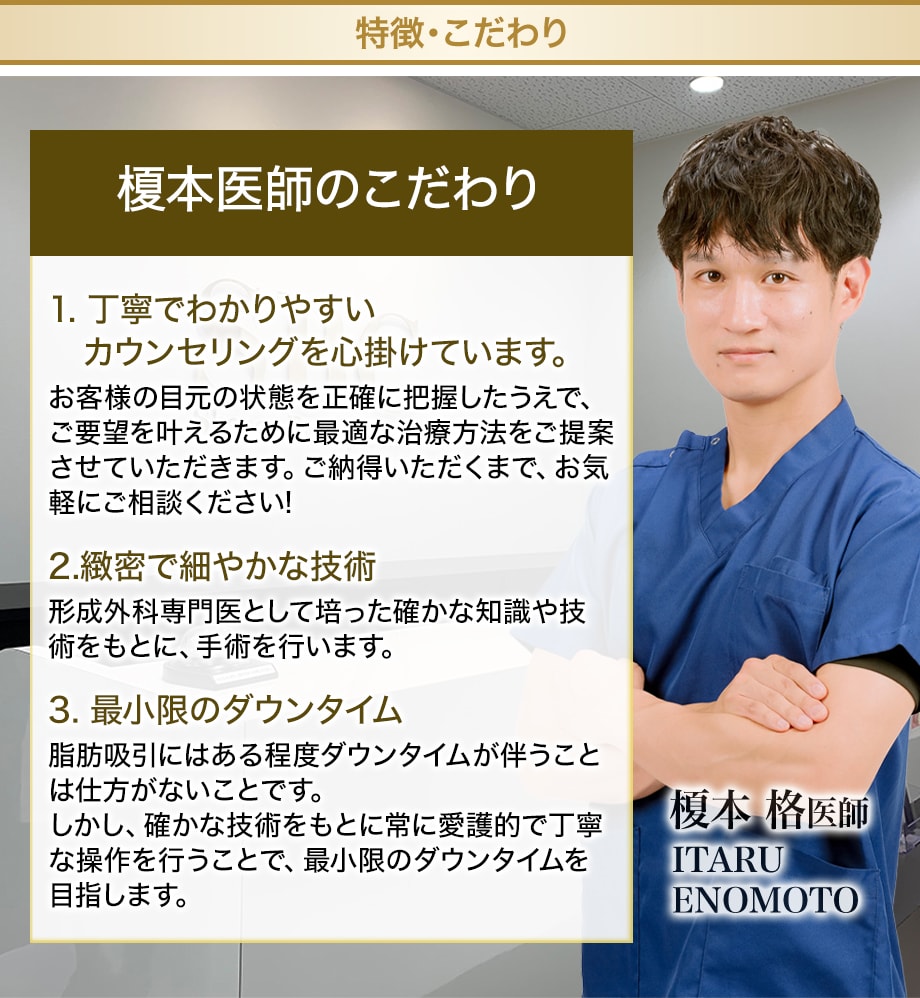 カウンセリングから術後のケアまで誠実に担当します。宮崎・九州の美のお悩みは、ベテランドクター榎本にお任せください。