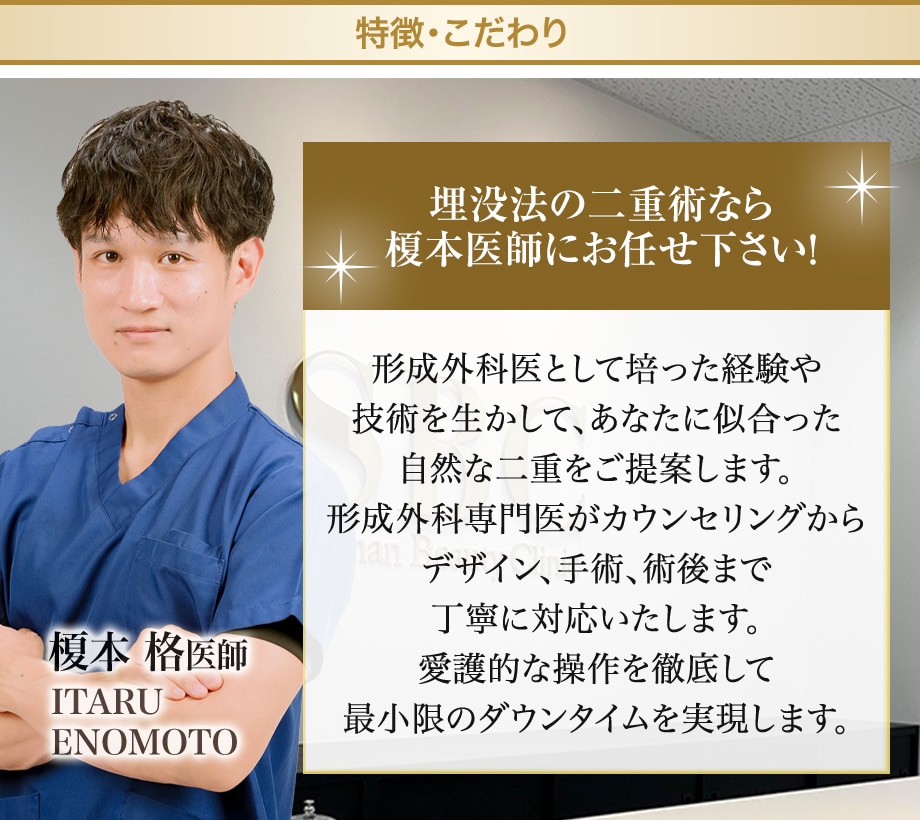 私は、傷や体の変形を治す「形成外科」と、美しさを追求する「美容外科」、両方の専門医資格を持つ医師です。体の構造を知り尽くしているからこそ、安全で体への負担が少なく、高い効果が期待できます。