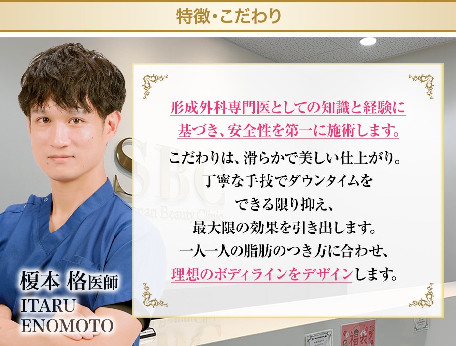 私は、傷や体の変形を治す「形成外科」と、美しさを追求する「美容外科」、両方の専門医資格を持つ医師です。体の構造を知り尽くしているからこそ、安全で体への負担が少なく、高い効果が期待できます。
