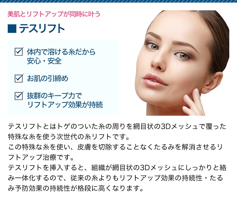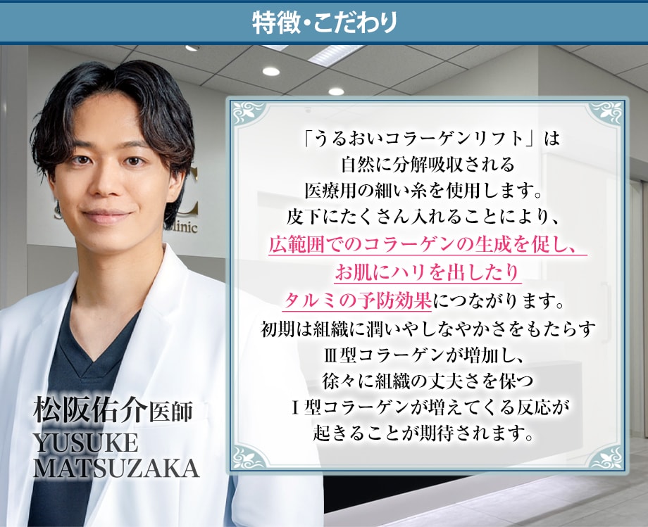 うるおいコラーゲンリフト(ショッピングスレッドリフト)は施術後のダウンタイムや痛みが少なく、引き締め効果・肌のうるおい、つやを体感できる、今もっとも注目されるアンチエイジング治療です。