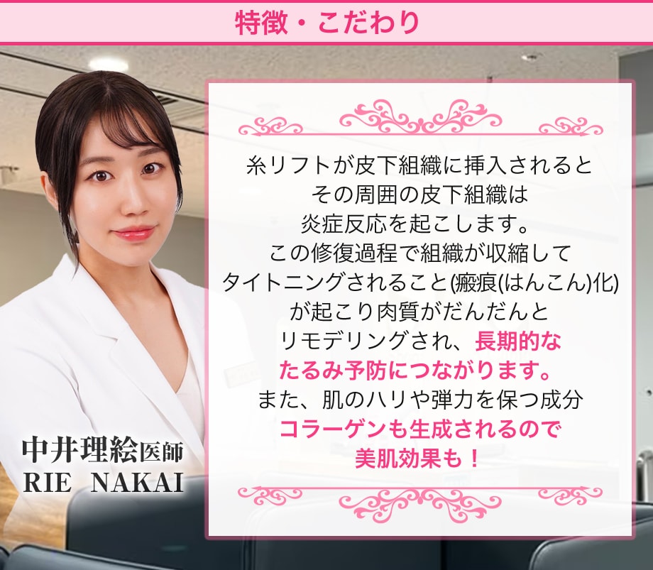 また糸をいれたことによる刺激で、お肌の中のコラーゲン生成が促され、時間とともに肌全体にハリをもたらすことが期待されます。