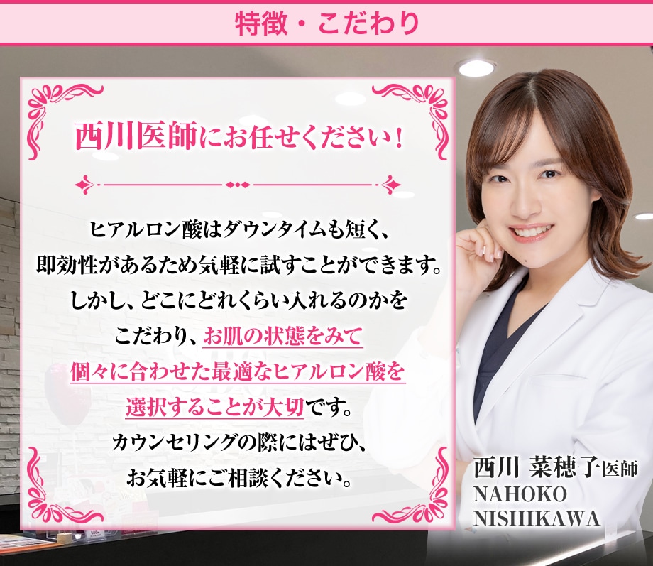 ヒアルロン酸の注入に使用される製剤は透明なジェル形態です。ヒアルロン酸の注入を行うと、もともと体内に存在していた自己のヒアルロン酸と融合して皮膚にふくらみを持たせ、シワを隆起させます。注射で注入するだけという、安全性と手軽さを兼ね備えた施術です。