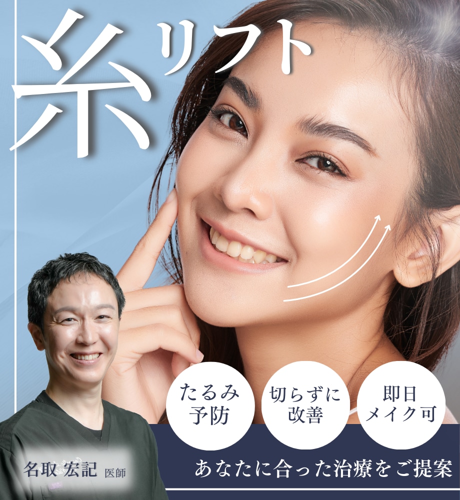 たるみは、お顔の印象を老けさせてしまう原因のひとつです。 治療には様々な方法があります。 切るほどではないが、レーザーでは物足りないという方にオススメなのが糸によるリフトアップです。