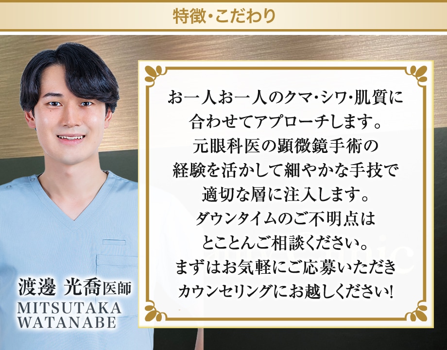 繊細な顕微鏡手術を経験してきた渡邊医師が、あなたにぴったりの注入箇所や注入量を見極めて施術いたします。