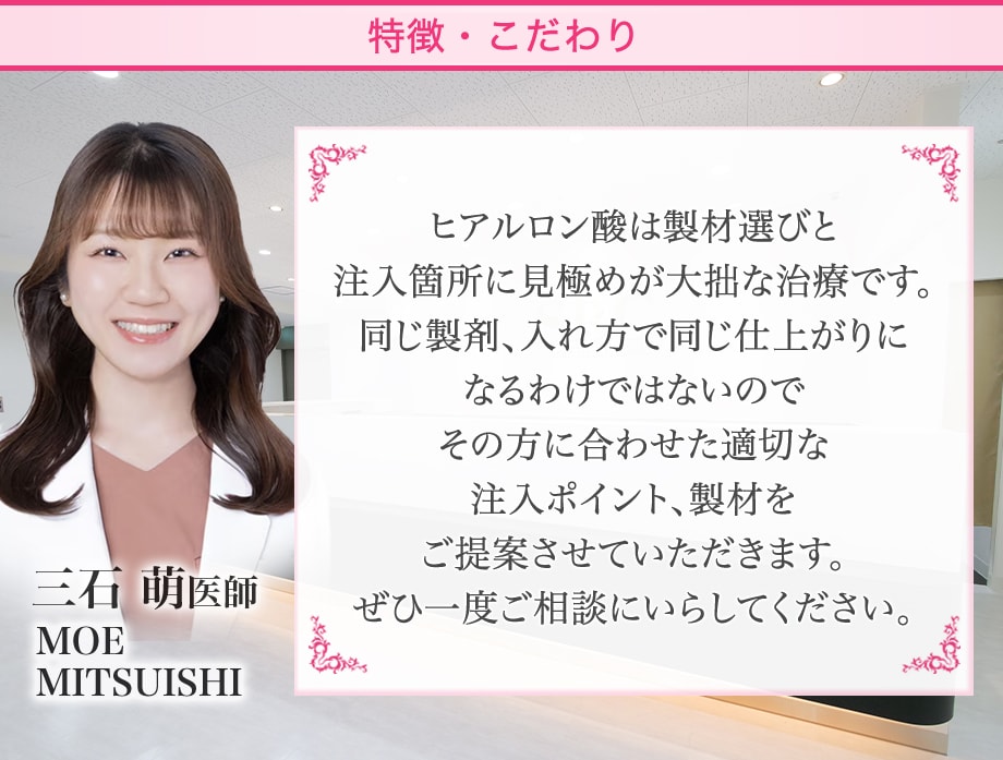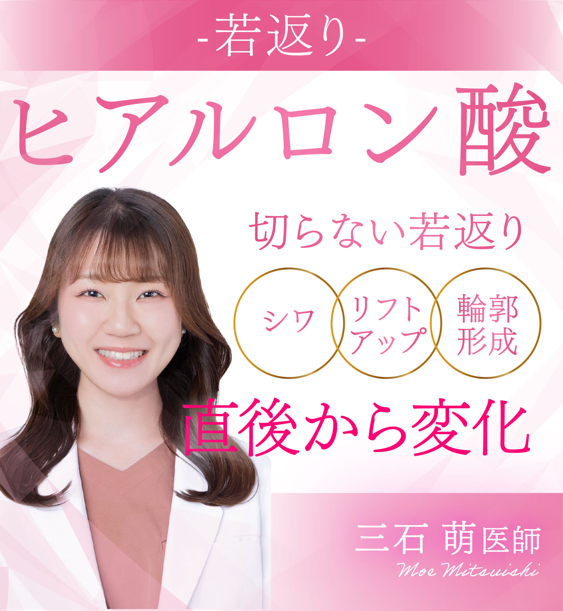 ヒアルロン酸を気になる部位に注入し、シワやハリ・肌質を改善する方法です。注射で注入するだけという、安全性と手軽さを兼ね備えた施術です。ヒアルロン酸の注入を行うと、もともと体内に存在していた自己のヒアルロン酸と融合して皮膚にふくらみを持たせ、シワを隆起させます。