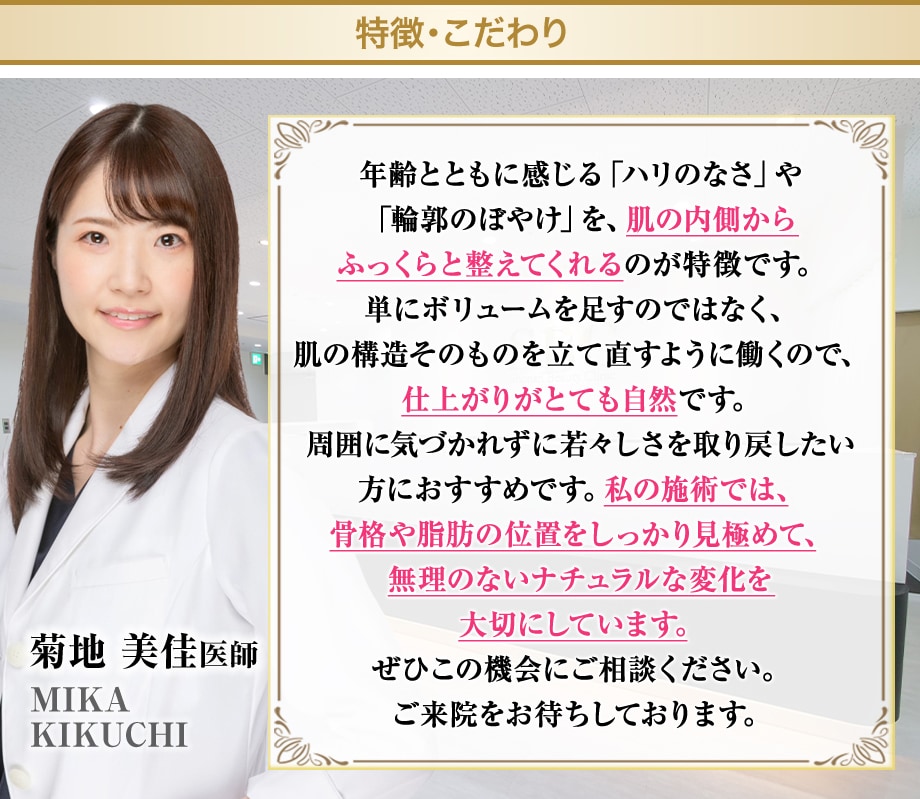 肌のハリ・弾力を取り戻したい、頬がこけて疲れて見える、手術まではしたくないけれど、しっかりエイジングケアをしたいと方へもおすすめの治療です。