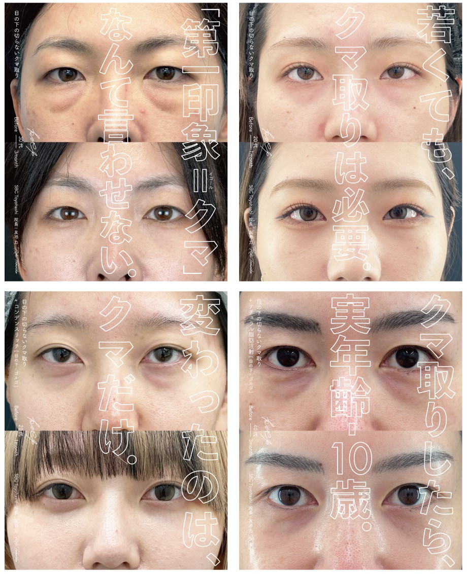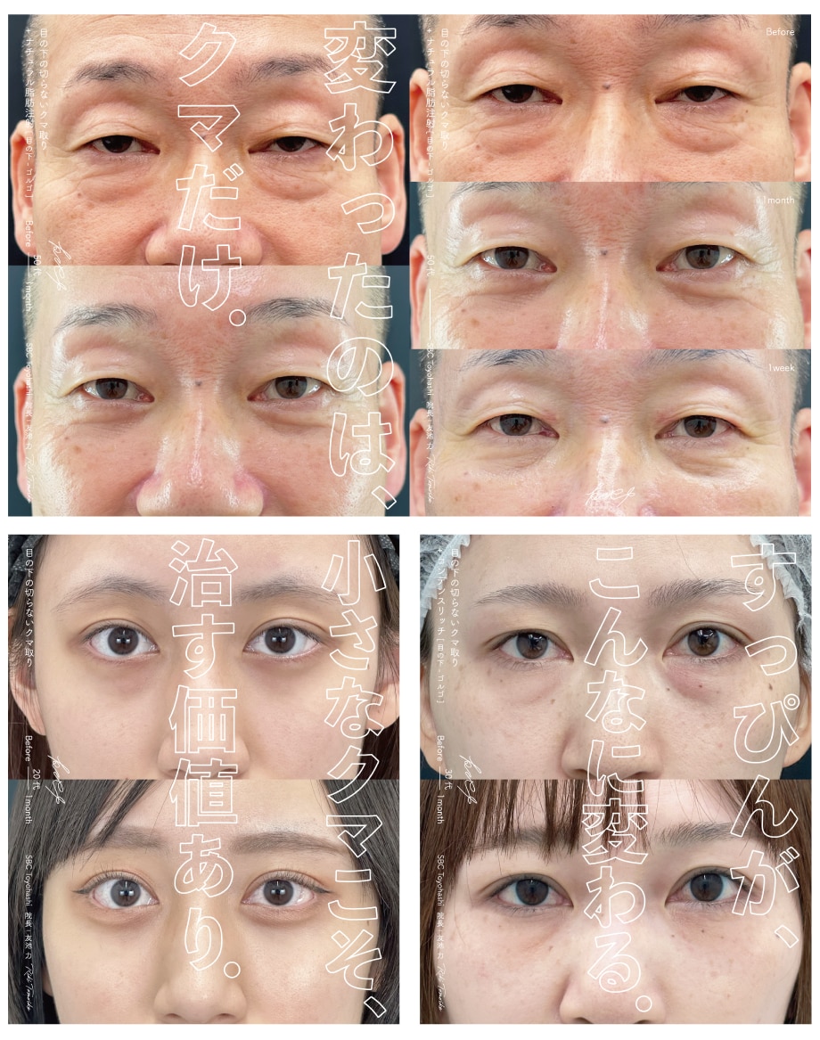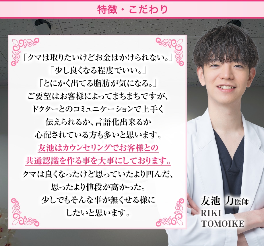 クマの主な原因は眼窩脂肪です。眼窩脂肪はただ取ればいいのでは無く、その人に合った取る量や取る場所のバランスが大事です。この様々な手術に共通する感覚は外科医としての経験が物を言います!友池は保険診療でも多くの手術を経験しておりバランス感覚に優れています。ぜひお任せ下さい。
