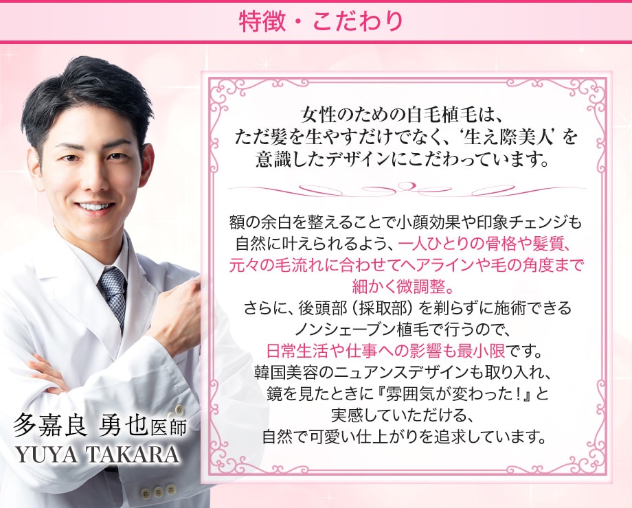 自毛植毛でつくる‘美人フレーム’は、薄毛治療目的だけでなく、美容目的で前髪や生え際のバランスを整えて横顔や顔全体の印象もナチュラルにアップ。