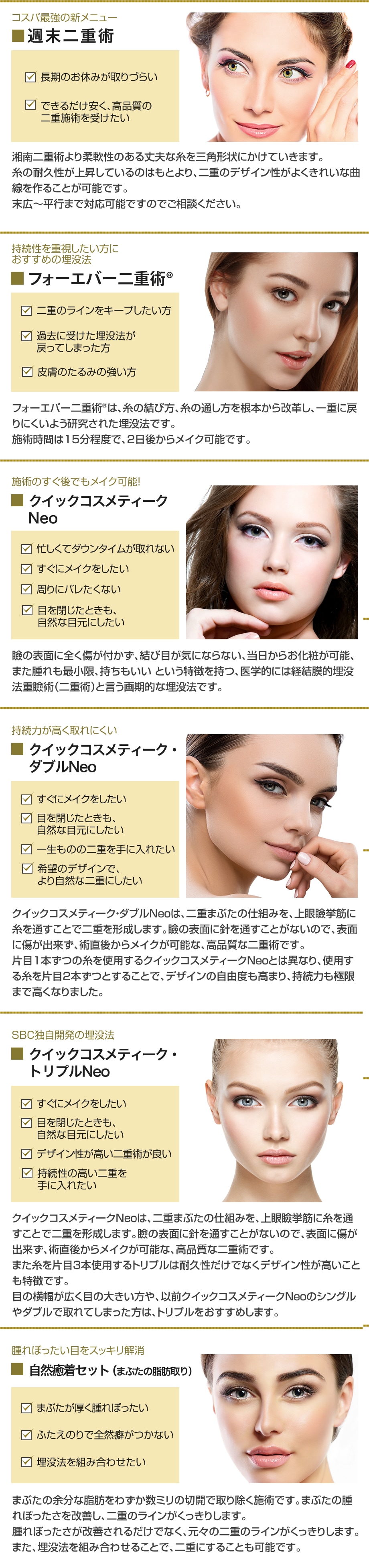 ・クイックコスメティーク・ダブルNeoハイブリッド法・目頭切開パークZ法・SBCデカ目術