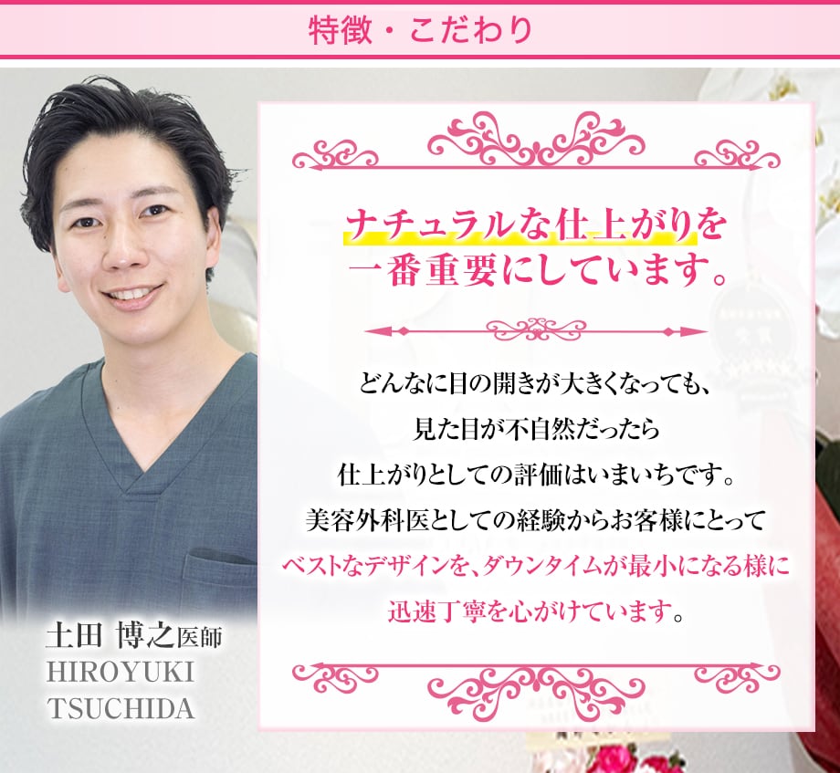 土田院長の『目頭切開パークZ法』なら、最短5日の抜糸(個人差有り)で傷跡が目立ちにくく、自然に目の開きや左右の距離のバランスを整えます。