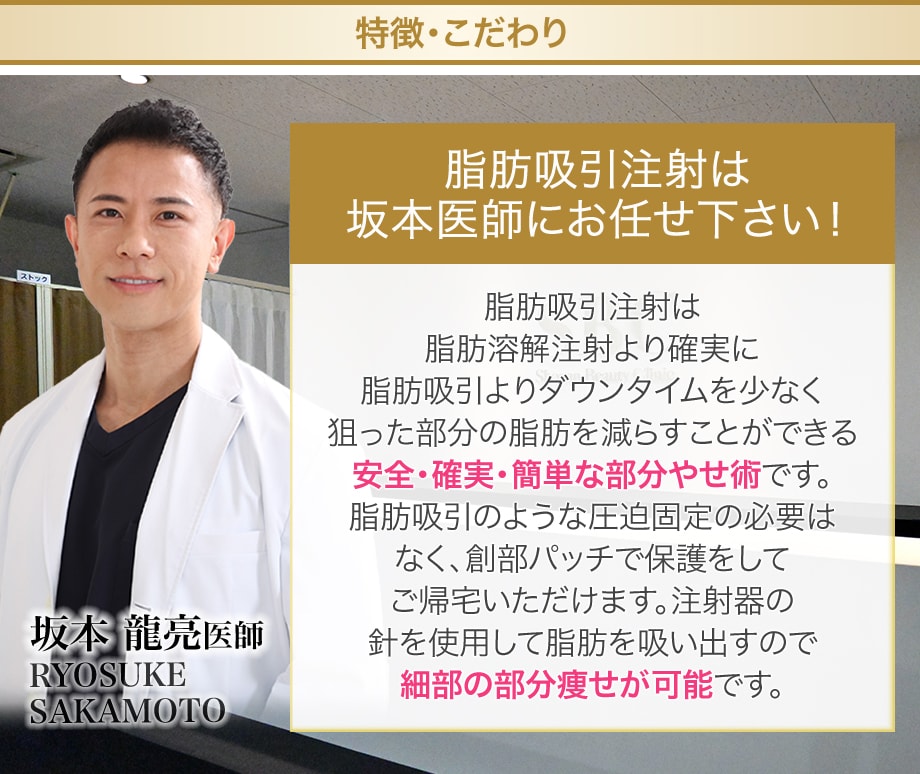 脂肪吸引注射は、【脂肪溶解注射や冷却による痩身治療は試してみたけれど効果がなかった】という方や、【痩せたいけど脂肪吸引は大袈裟と感じる】という方、【ダウンタイムが取れない】という方におすすめの部分痩せ術です。