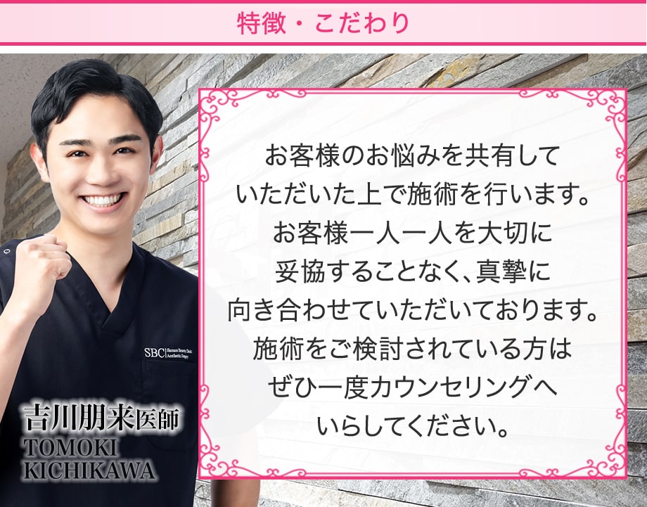吉川医師は親しみやすく、丁寧なカウンセリングを行いますので、美容クリニックが初めての方も安心してご相談ください。