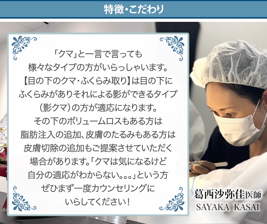 クマ取りをするなら下眼瞼の解剖を熟知した形成外科専門医の葛西におまかせ!
