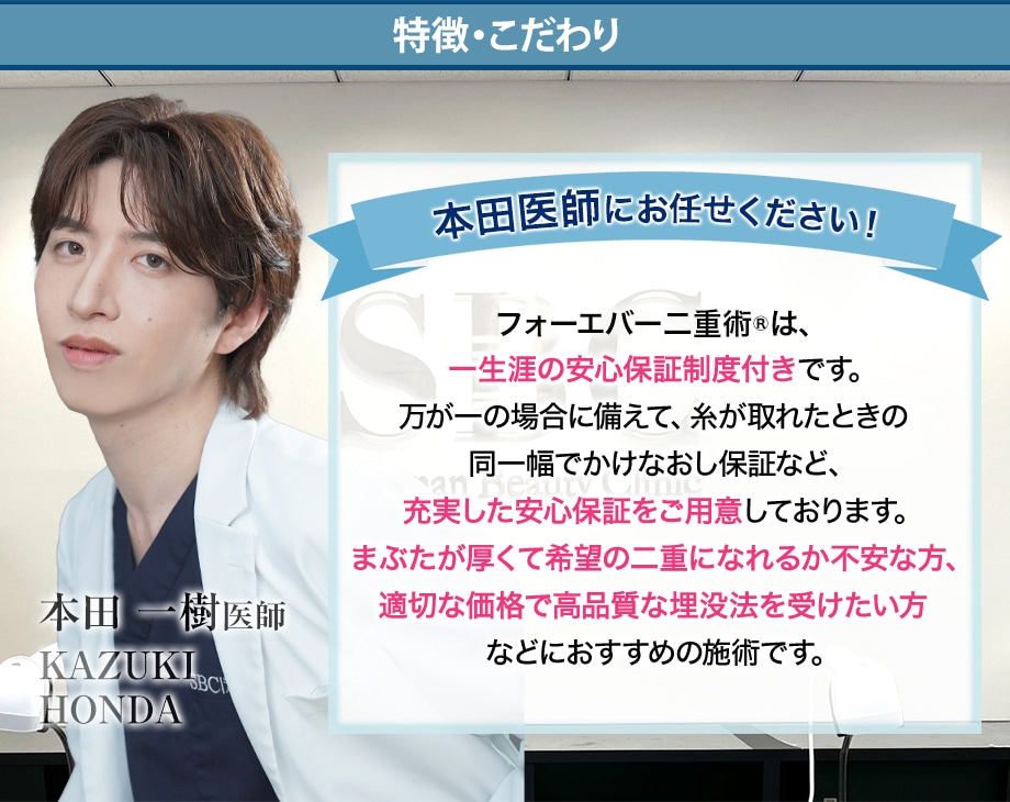 上まぶたの“瞼板”と呼ばれる軟骨ほどの硬さの板にトライアングル形式で、 極細の医療用糸を留めるので、従来の埋没法に比べ術後の腫れが抑えられ、持ちも良いのが特徴です。