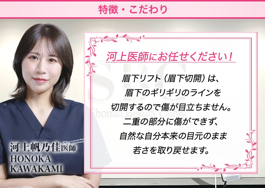 まぶたの余剰皮膚を除去して引き上げ、眉毛に沿って縫合することで、傷跡がほとんど目立ちません。二重術なしで目ヂカラUPや若返りの効果が期待できます。