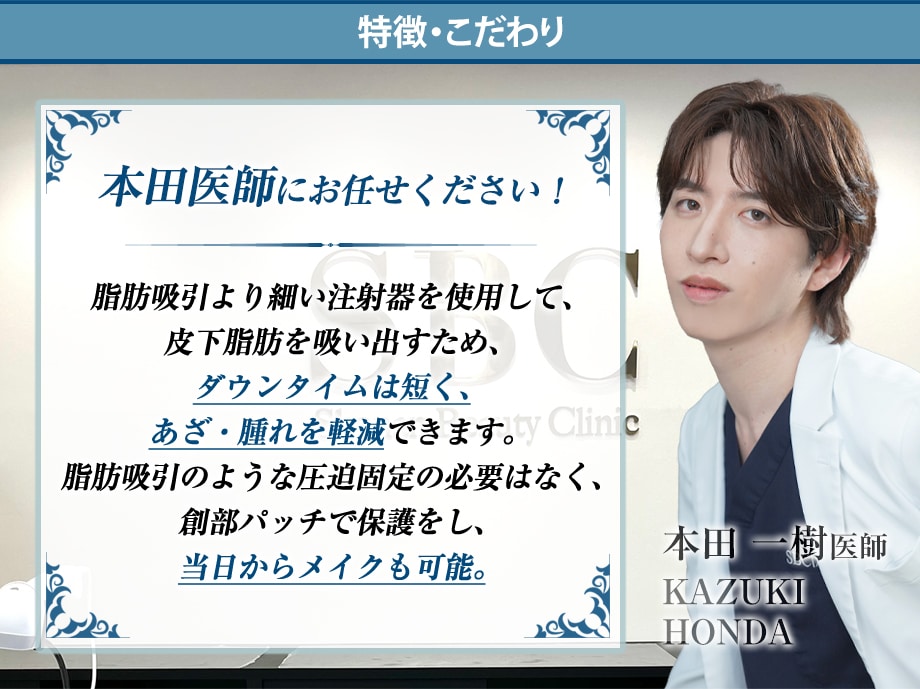 切開なしで脂肪を直接抽出できるので、脂肪溶解注射より確実に、脂肪吸引よりダウンタイムを少なく、狙った部分の脂肪を減らすことができる安全・確実・簡単な部分やせ術です。