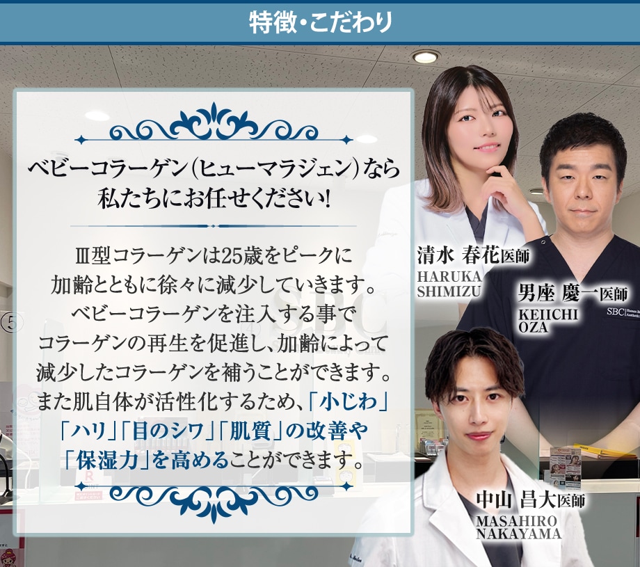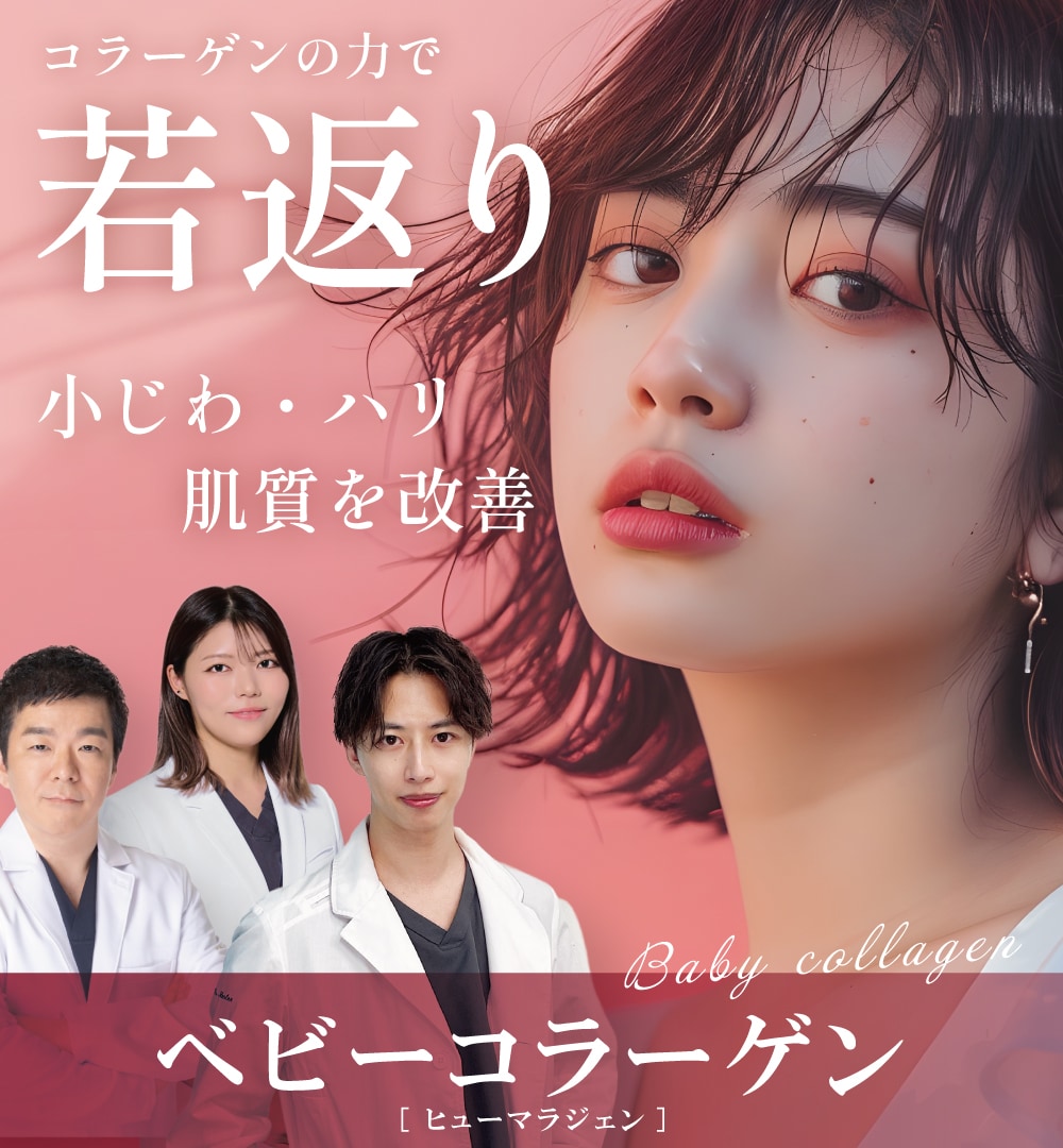 この施術は、I型とIII型コラーゲンを50:50で配合し、肌に直接注入することで、肌細胞の再生を促し、ハリや弾力、保湿力を改善します。 特にヒアルロン酸やボトックスが難しい目周りの小じわに効果的で、ヒト由来の薬剤のためアレルギーのリスクが少なく安全に失われたコラーゲンを補充できる点が特徴です。
